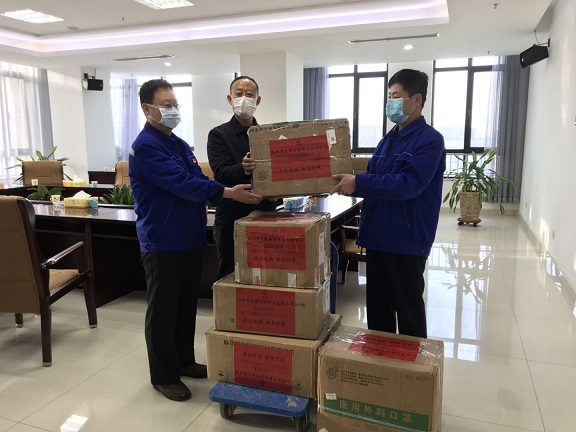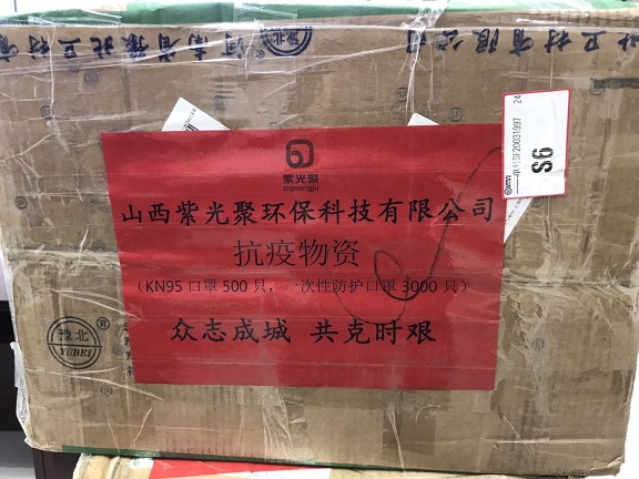 3月7日,山西紫光聚環(huán)保科技有限公司捐贈的口罩交接到位。