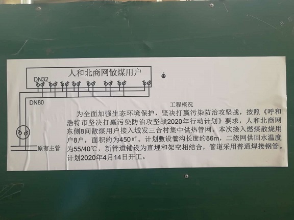 按照《呼和浩特市堅決打贏污染防治攻堅戰(zhàn)2020年行動計劃》總體要求,該項目接入燃煤散燒用戶42戶,面積約2450平方米,其中一家村豐州路西34戶,2000平方米;人和北商網(wǎng)8戶,450平方米。該項目計劃敷設管線溝槽長度約174米,其中一家村豐州路西為88米,人和北商網(wǎng)為86米。新管道鋪設以直埋和架空相結(jié)合的方式,全部采用普通焊接鋼管,開工時間為2020年4月14日。