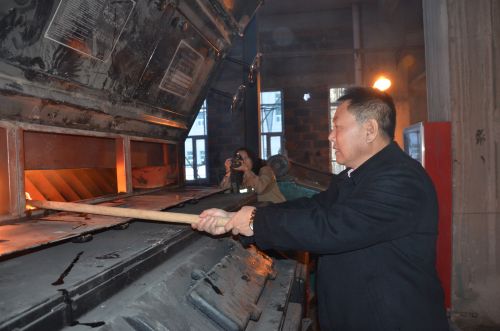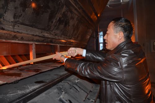 (城發(fā)公司副總經(jīng)理梁永慶,手持火把密切關注爐膛內(nèi)火焰燃燒的態(tài)勢。李波攝)