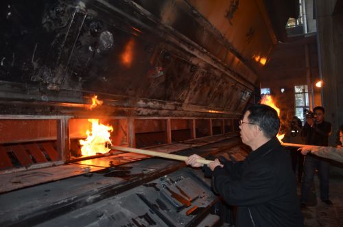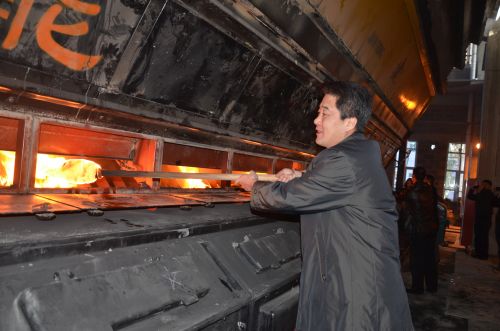 (城發(fā)公司副總經(jīng)理史繼文將熊熊燃燒的火把放入爐內(nèi),