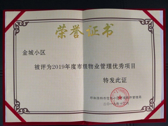 城發(fā)物業(yè)金城小區(qū)項目處在物業(yè)公司領(lǐng)導(dǎo)的指引下,為打造紅色物業(yè)創(chuàng)新經(jīng)營模式,強化品質(zhì)管理,提升精細(xì)化、人性化服務(wù)的同時,被呼和浩特市住宅小區(qū)環(huán)境秩序管理局評為物業(yè)管理2019年度市級優(yōu)秀項目。
