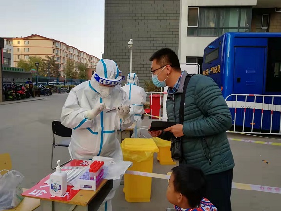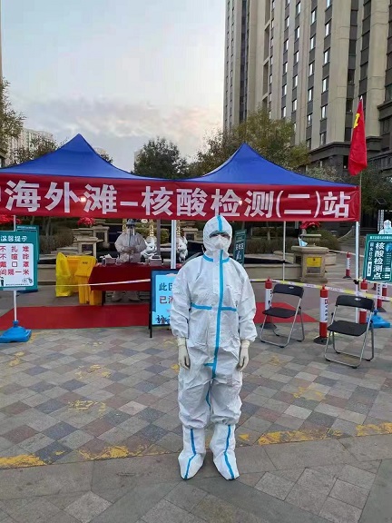集團宣傳部翟玉卿參加金漢御園小區(qū)核酸檢測志愿服務(wù)。