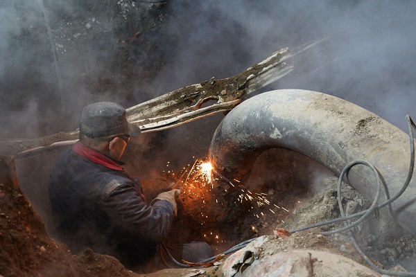 "找到啦!"隨著一聲驚呼,一條約20公分長的裂口,赫然出現(xiàn)在人們面前。雖然當(dāng)時(shí)已經(jīng)是晚上8點(diǎn)多,室外的氣溫也在持續(xù)下降,為了盡快恢復(fù)供熱,大家沒有休息,馬不停蹄的開始了緊張的堵漏工作。經(jīng)過一夜的奮戰(zhàn),終于在23日早6點(diǎn)半結(jié)束搶修,開始注水。在停暖15個(gè)小時(shí)后,恢復(fù)正常供熱,確保了62萬平米內(nèi)的熱用戶家中溫度及時(shí)上升。