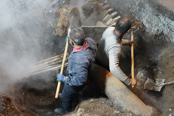 筆者于晚間6:00抵達(dá)搶修現(xiàn)場時(shí),大老遠(yuǎn)地就看見沿路的井蓋都冒著白色的水蒸氣,進(jìn)入搶修現(xiàn)場,筆者看到,橋靠分公司總經(jīng)理阮強(qiáng)、副總經(jīng)理張國良、運(yùn)營四所所長馮俊及公用事業(yè)管理局相關(guān)領(lǐng)導(dǎo)在現(xiàn)場緊鑼密鼓地指揮著搶修?,F(xiàn)場兩個(gè)搶修師傅正在一個(gè)10平方米、2米多深的大坑中,一鍬一鍬地奮力挖著坑內(nèi)的土,現(xiàn)場工作人員介紹到,因?yàn)橐呀?jīng)接近管道,為確保管道的安全,目前只能人工挖掘。當(dāng)時(shí)的室外溫度在-11℃,工人們卻是滿頭大汗。