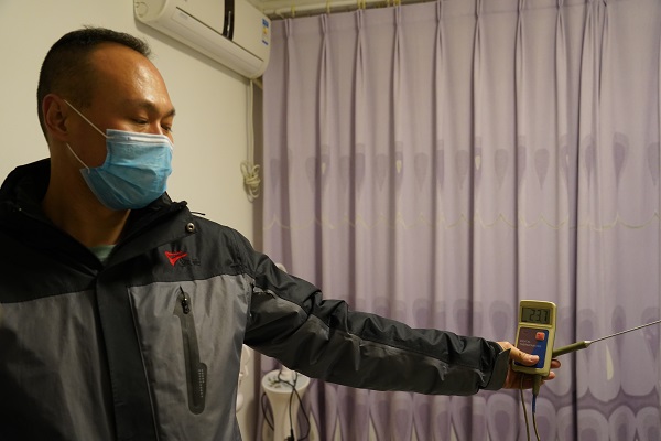 在20號(hào)樓3單元6樓的住戶家中,劉婷用手摸了摸用戶家的地板磚,通過(guò)人體的直觀感受,發(fā)現(xiàn)用戶家地暖存在散熱不均勻的現(xiàn)象??头芗矣脤I(yè)的測(cè)溫儀和熱成像儀,進(jìn)行了測(cè)溫。經(jīng)檢測(cè),該用戶家各房間平均溫度均在23℃以上。用戶說(shuō),家中較冷的房間是廚房,客服管家又針對(duì)廚房進(jìn)行了測(cè)溫,發(fā)現(xiàn)室溫要比其他房間溫度低一些,但熱成像儀測(cè)得的結(jié)果與其他房間一致。經(jīng)過(guò)觀察與分析,發(fā)現(xiàn)用戶家廚房與陽(yáng)臺(tái)間的隔斷是一扇落地大玻璃門,保溫效果較差,導(dǎo)致廚房溫度低于其他房間。聽(tīng)了工作人員的講解,用戶也表示了認(rèn)可,對(duì)我們的排查結(jié)果及服務(wù)態(tài)度表示滿意。