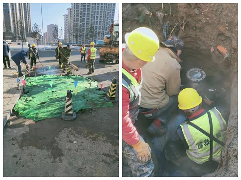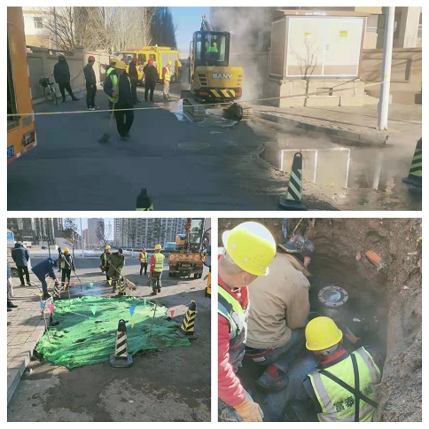 大年初二這天早上,富泰熱力公司巴彥分公司廠區(qū)門口路面滲水,疑似一次網(wǎng)發(fā)生跑水。得知這一情況后,分公司檢修所工作人員在對跑水位置進行初步判斷后,立即聯(lián)系了安裝分公司。嚴(yán)陣以待的安裝分公司搶修隊員第一時間趕往現(xiàn)場,發(fā)現(xiàn)現(xiàn)場有配電箱,地下有電纜、天然氣管,機械開挖比較危險,于是人工對路面進行開挖,進一步尋找漏點。經(jīng)過查找,發(fā)現(xiàn)是一次網(wǎng)上一個50抽頭發(fā)生跑水,他們不顧刺骨寒風(fēng)帶水作業(yè),給抽頭焊接了一個150的套管,又在套管上安裝了一個150的法蘭球閥,等做好保溫回填地面后,已經(jīng)是第二天凌晨4點了。大年初五,安裝分公司又接到了左右城小區(qū)跑水搶修任務(wù)。由于施工難度較大,搶修隊員們一刻不停歇的干了一天才完成任務(wù),及時恢復(fù)了供暖。