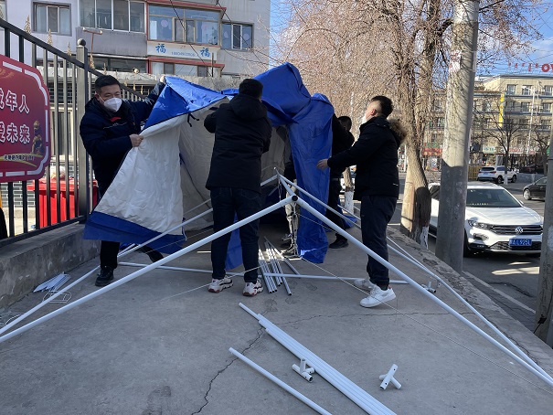 連日來,公司的近百名員工陸續(xù)被派往社區(qū)一線支援疫情防控工作,事務(wù)管理中心安排專人和他們保持聯(lián)系,及時(shí)把一次性醫(yī)用外科口罩、N95口罩、防護(hù)服、防護(hù)手套、隔離面罩等疫情防控物資送到各個(gè)值守點(diǎn)。2月28日,事務(wù)管理中心主任胡夢園、黨支部書記劉紅梅在電子路社區(qū)值守點(diǎn)查看時(shí),發(fā)現(xiàn)當(dāng)班的員工在寒風(fēng)中堅(jiān)守著,及時(shí)為他們搭建了帳篷,送來了電暖氣。