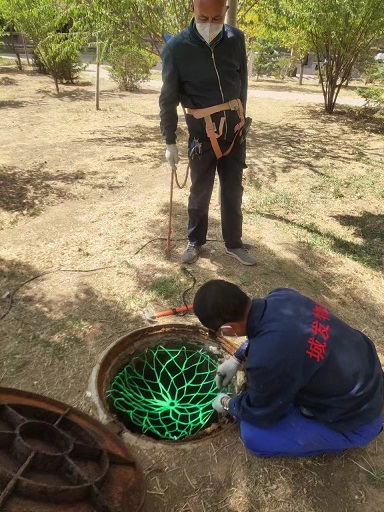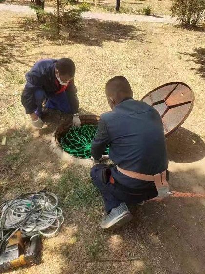 安裝現(xiàn)場,工作人員打開井蓋通風(fēng),在用氣體檢測儀檢測井內(nèi)的氣體符合作業(yè)條件后,工作人員綁好安全帶用電鉆在井壁上鉆孔,釘入尾端帶鉤的膨脹螺栓,擰緊固定后將防墜網(wǎng)掛到掛鉤上,一張防墜網(wǎng)就安裝完成?,F(xiàn)場工程師傅每完成一個防墜網(wǎng)的安裝,在確保安全的情況下,都會親身踩試檢驗,確保安裝牢固。