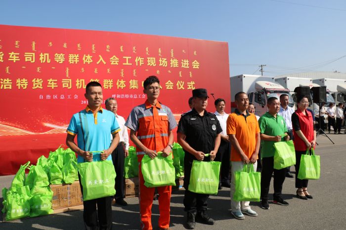 在場的各位領(lǐng)導(dǎo)、貨車司機等工作人員共同聽取了自治區(qū)總工會關(guān)于貨運司機等群體的入會報告后,激情昂揚的宣讀了入會誓詞。自治區(qū)、呼市兩級總工會的各位領(lǐng)導(dǎo)向與會的各單位頒發(fā)了工會會員證,并向入會貨車司機發(fā)放了慰問品。