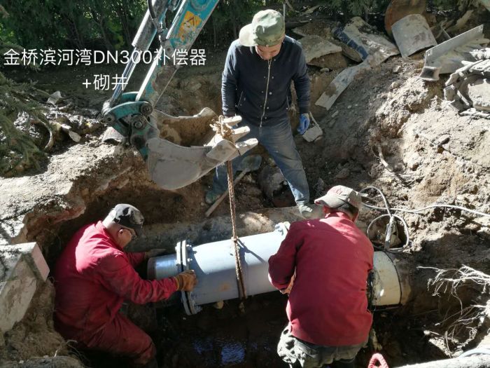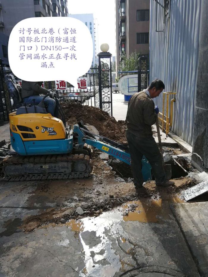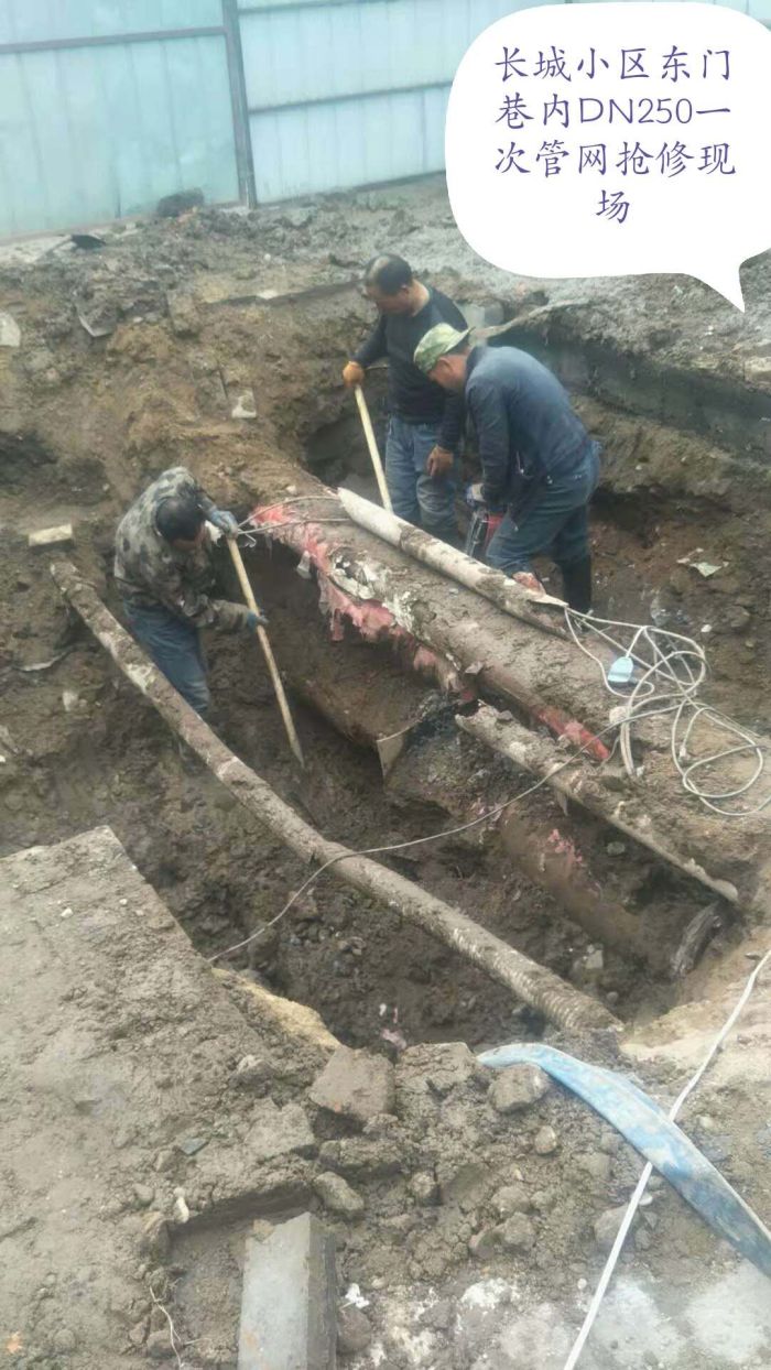 9月29日,管網(wǎng)公司接到辛家營供熱分公司搶修通知,騰飛南路如意廣場環(huán)形路口北側(cè)東綠化帶中發(fā)現(xiàn)一處冒水現(xiàn)象。管網(wǎng)公司領(lǐng)導(dǎo)高度重視,迅即安排人手,查找漏水點。他們憑借豐富的搶修經(jīng)驗,決定采用十字釘,直架設(shè)于涵管之上,創(chuàng)造人工作業(yè)通道,根據(jù)涵管內(nèi)水流方向判斷,搶修人員在胸腹部綁上滑板及護具,在DN600熱力管道中向西滑行50米左右,終于發(fā)現(xiàn)了漏水點。為了給供暖投運工作贏取時間,參與搶修的20余人輪班作業(yè),連續(xù)奮戰(zhàn)7個晝夜,10月6日,圓滿完成搶修任務(wù)。