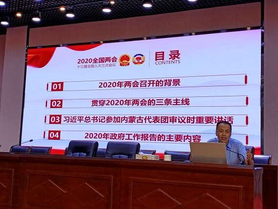 孫忠輝副教授以2020年全國兩會(huì)精神為專題,分別對2020年兩會(huì)召開的背景、貫穿2020年兩會(huì)的三條主線、習(xí)近平總書記參加內(nèi)蒙古代表團(tuán)審議時(shí)重要講話、2020年政府工作報(bào)告的主要內(nèi)容做了深入的解讀與細(xì)致的講解。兩會(huì)號召全國各族人民要更加緊密地團(tuán)結(jié)在以習(xí)近平同志為核心的黨中央周圍,高舉中國特色社會(huì)主義偉大旗幟,以習(xí)近平新時(shí)代中國特色社會(huì)主義思想為指導(dǎo),全面貫徹黨的十九大和十九屆二中、三中、四中全會(huì)精神,堅(jiān)決貫徹黨的基本理論、基本路線、基本方略,增強(qiáng)“四個(gè)意識”、堅(jiān)定“四個(gè)自信”、做到“兩個(gè)維護(hù)”,緊扣全面建成小康社會(huì)目標(biāo)任務(wù),統(tǒng)籌推進(jìn)疫情防控和經(jīng)濟(jì)社會(huì)發(fā)展工作,在疫情防控常態(tài)化前提下,堅(jiān)持穩(wěn)中求進(jìn)工作總基調(diào),堅(jiān)持新發(fā)展理念,堅(jiān)持以供給側(cè)結(jié)構(gòu)性改革為主線,堅(jiān)持以改革開放為動(dòng)力推動(dòng)高質(zhì)量發(fā)展,堅(jiān)決打好三大攻堅(jiān)戰(zhàn),加大“六穩(wěn)”工作力度,全面落實(shí)“六保”任務(wù),堅(jiān)定實(shí)施擴(kuò)大內(nèi)需戰(zhàn)略,維護(hù)經(jīng)濟(jì)發(fā)展和社會(huì)穩(wěn)定大局,同心協(xié)力,攻堅(jiān)克難,銳意進(jìn)取,確保完成決戰(zhàn)決勝脫貧攻堅(jiān)目標(biāo)任務(wù),全面建成小康社會(huì)。同時(shí)闡明了中華民族向來不畏艱難險(xiǎn)阻、當(dāng)代中國人民有戰(zhàn)勝任何挑戰(zhàn)的堅(jiān)定意志和能力。