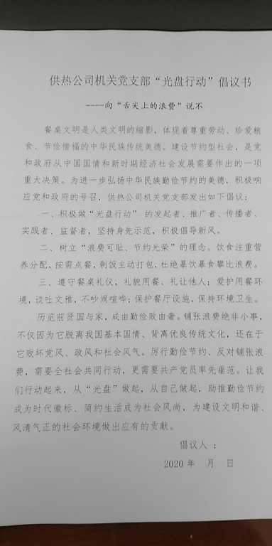 為了進(jìn)一步弘揚(yáng)中華民族勤儉節(jié)約的美德,積極響應(yīng)黨和政府的號召。9月9日上午開始,城發(fā)供熱公司機(jī)關(guān)黨支部黨員、發(fā)展對象、積極分子共40人陸續(xù)簽署“光盤行動(dòng)”倡議書。